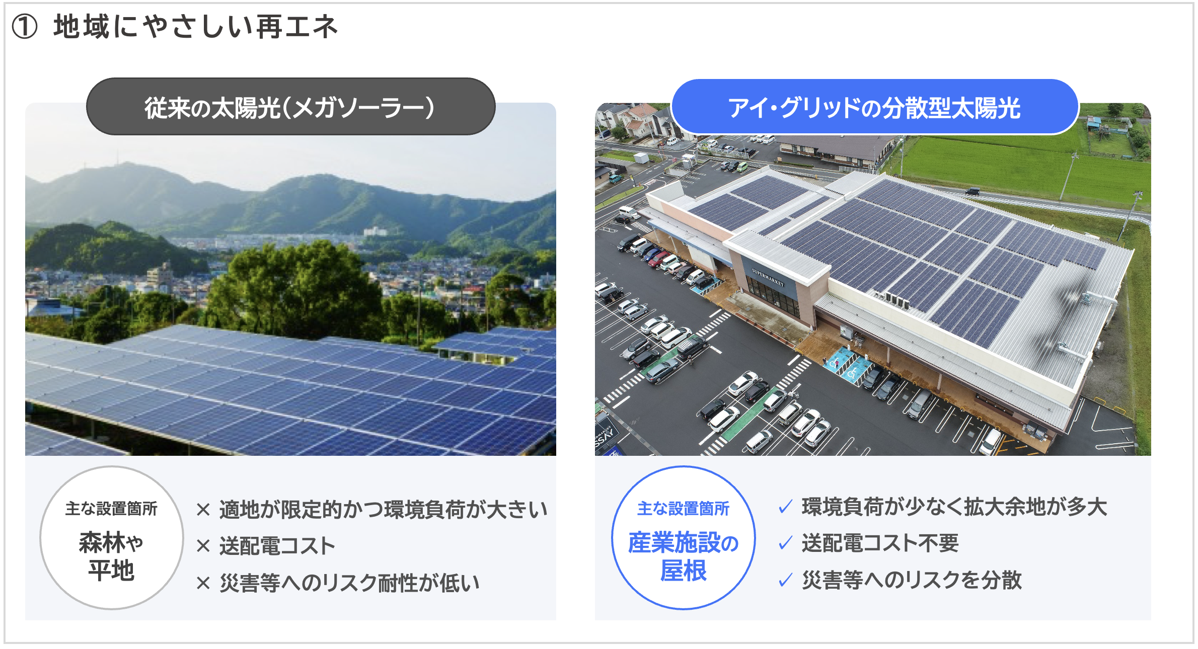 従来の再エネ導入は、主に適地不足、初期投資、遠くから電力を送る送配電利用の負担(コスト)という課題があります。次世代の選択肢の土台を築くのが、分散型太陽光の戦略的優位性です。