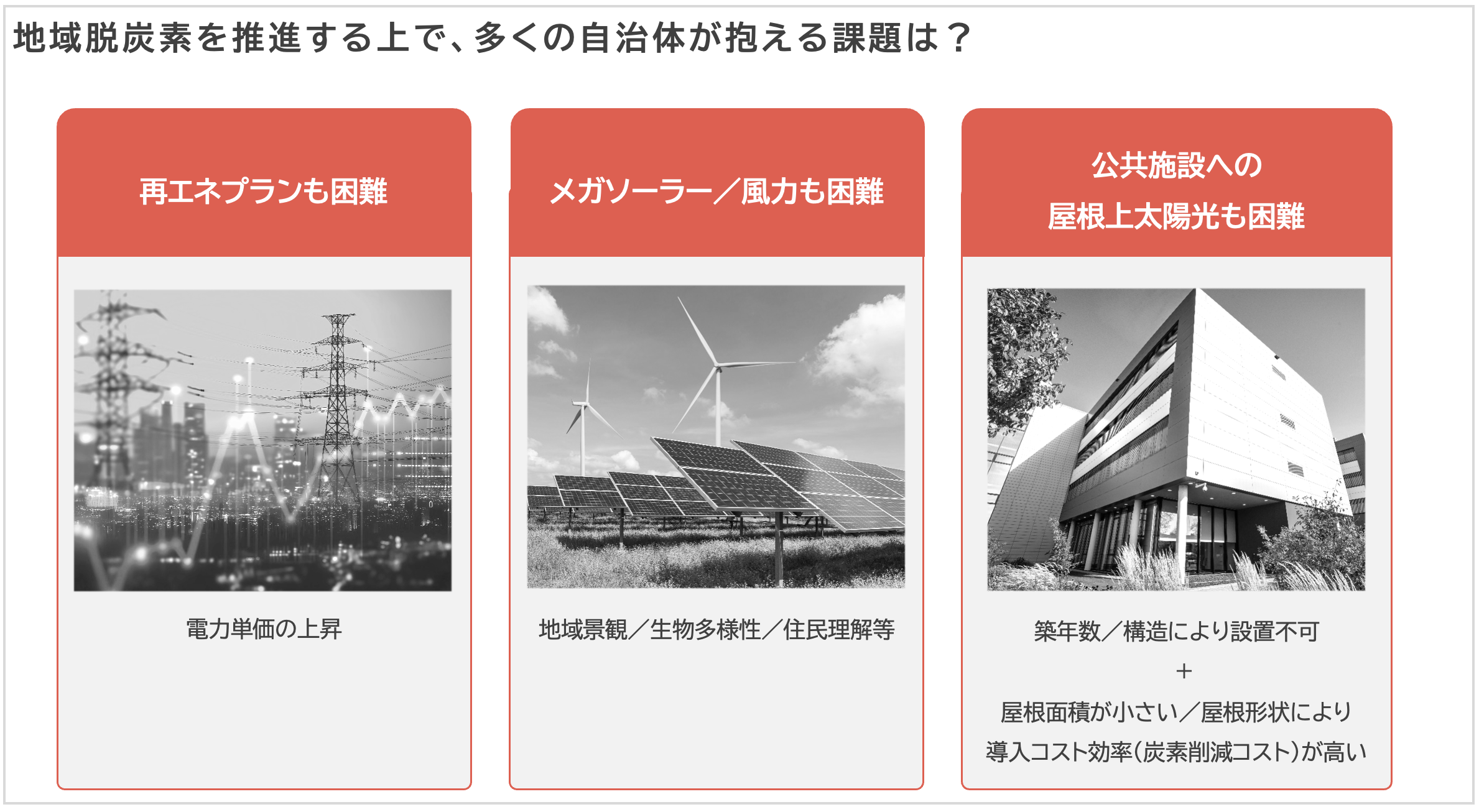 今、私たちが脱炭素を推進する中で、「コストの安定化と再エネ調達の両立」と「地域社会との共生」は、避けて通れない重要課題です。しかし多くの主体が地域脱炭素推進をする上で課題に直面しているのが現状です。