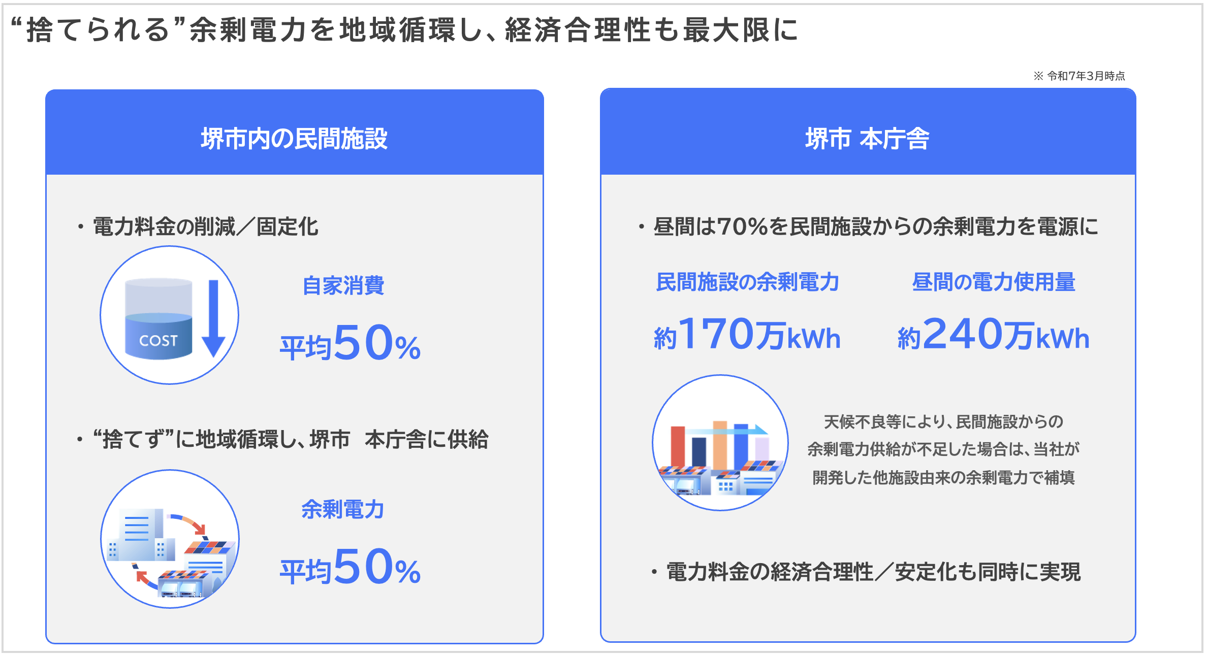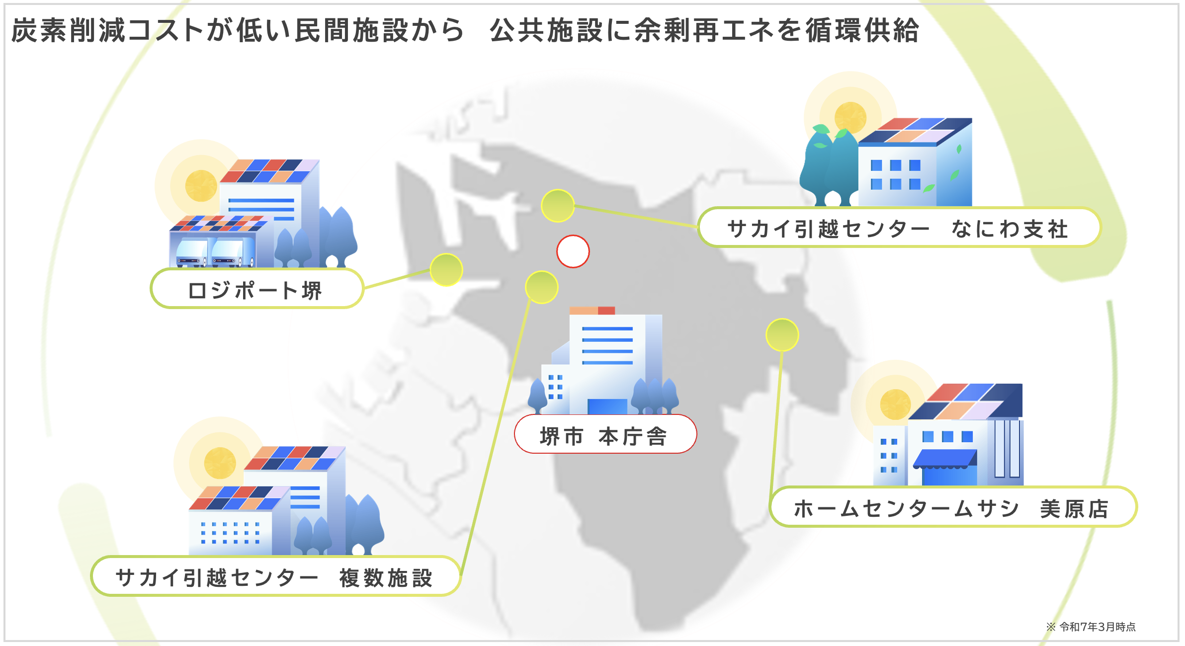 公共施設(需要側)との連携: 民間施設で発電された電力の余剰分を、堺市本庁舎に送配電網を介して融通してもらうことで、初期投資なしに再エネ調達量を大幅に増加させます。これにより、地域の再エネ循環を最大化することが可能になります。
